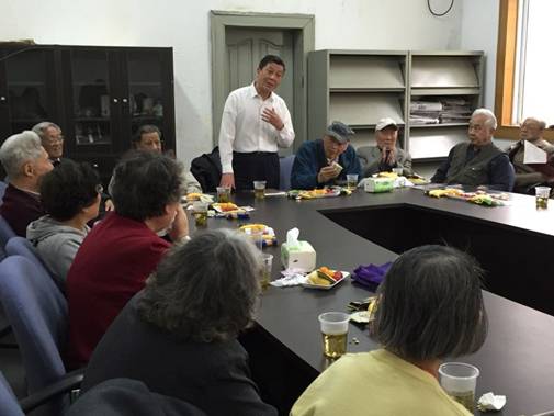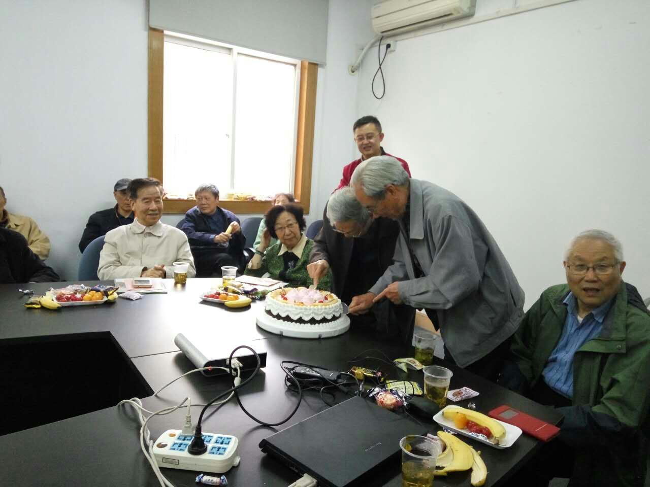 在大家合唱的生日歌歌声中,汪希龄和吴寿民两位老教师为大家切开生日蛋糕,老教师们坐在一起品尝生日蛋糕,回忆年轻时代,畅谈学院未来,熊老师给大家献歌和诗朗诵,不知不觉已到傍晚。