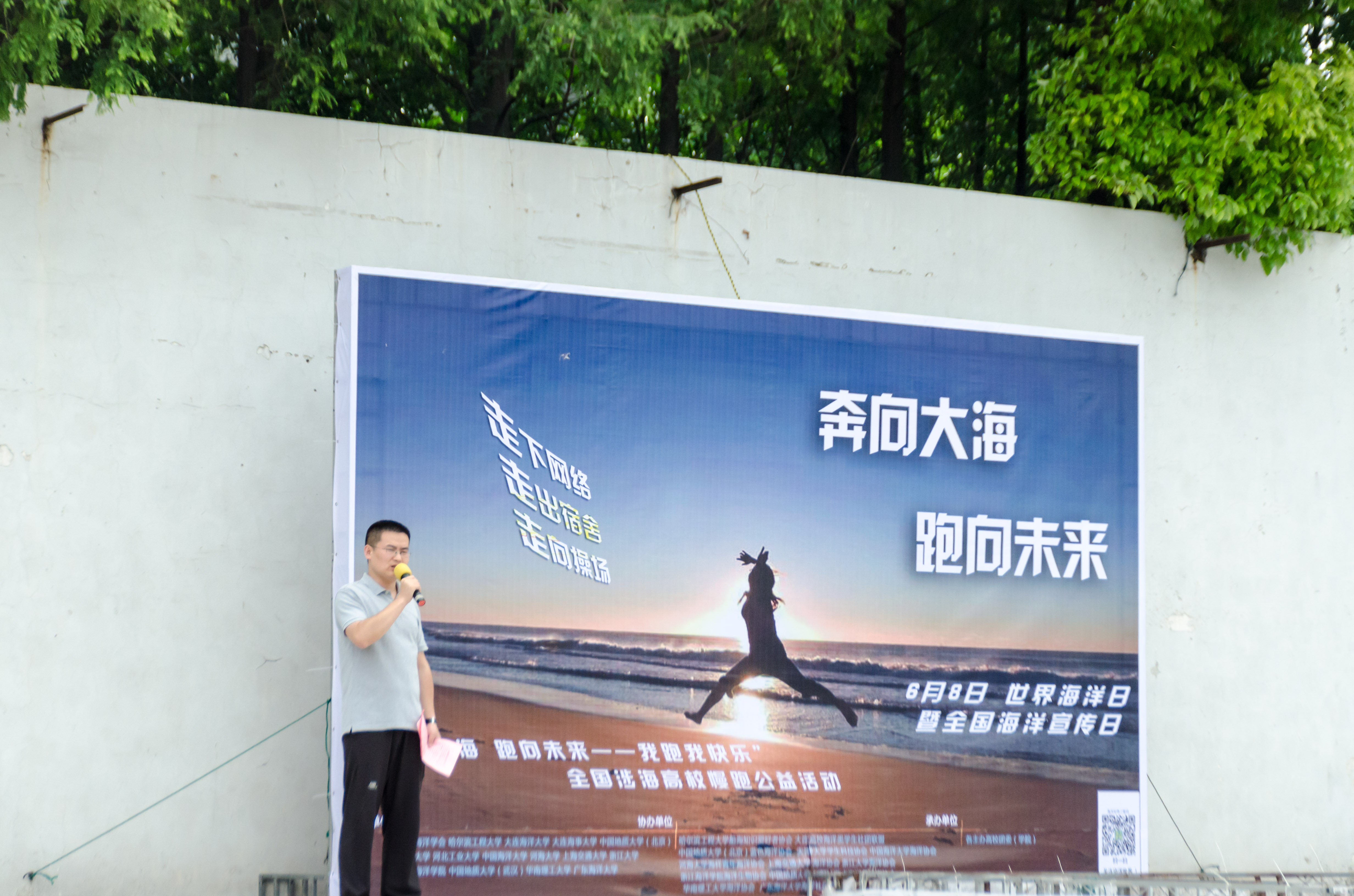 随后,主持人宣读了活动规则,海洋专题定向越野比赛正式开始。同学们身穿印有“奔向大海,跑向未来”标语的白色T恤,在慢跑中收获了珍贵的友谊,也体会了活动传递出的探索海洋、开发海洋、保护海洋的理想与责任感。