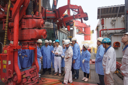 启东中远海工人力资源部经理梁金丹首先带领船建师生参观了禁漫展厅,简要介绍了公司的企业情况和海工设计产品。随后,大家进行了临时入厂安全培训,佩戴好劳护用品,在海工项目经理的带领陪同下,登上了在建的海工平台“希望四号”。“希望号”系列是中远船务工程集团有限公司研发团队完成的“深海高稳性圆筒型钻探储油平台的关键设计与制造技术”成果,突破了传统设计思路,不再是钻井平台四四方方的传统构架,主船体采用能抗巨大风浪的圆筒型整体结构设计,犹如一个“不倒翁”,在极端恶劣海况下安然无恙。该成果荣获了2011年度国家科技进步一等奖,这是国内海洋工程装备制造企业首次获得的国家科技殊荣。能有机会登上在建的海工平台,与技术专家充分探讨交流,直观的感受体验船厂的工作环境,对学生来说是十分宝贵的经历。