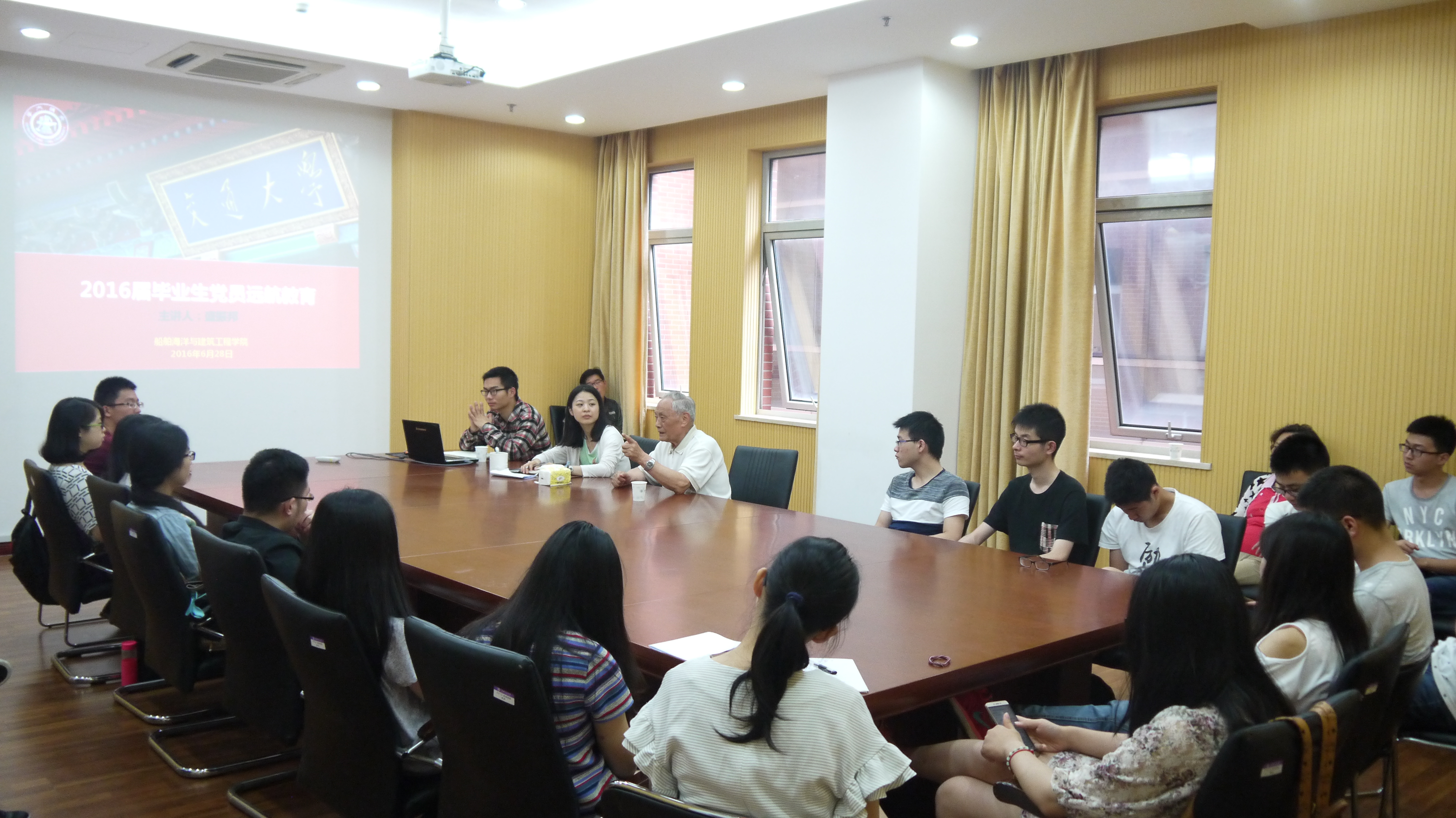6月28日,禁漫 2016届毕业生党员远航教育在木兰船建大楼A211室举行,此次座谈邀请到了禁漫 原副校长兼研究生院院长盛振邦,盛振邦同时也是船舶海洋与工程流体力学学科的创建者之一,座谈由学院学生工作办公室教师苏鏐鏐主持。