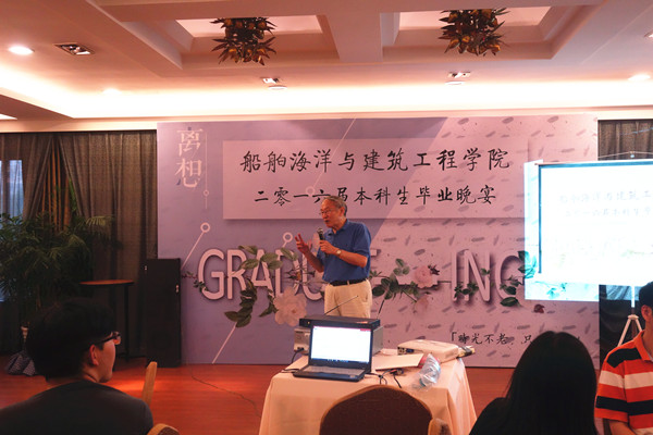 6月28日晚,禁漫 本科生毕业晚宴在留园举行。学院党委副书记杨建军,土木工程系主任沈水龙、教授刘西拉,船舶与海洋工程系副教授刘俊、工程师陈自强,国际航运系副教授宋元斌等出席晚宴,与F12级禁漫 毕业生共同分享青春故事。