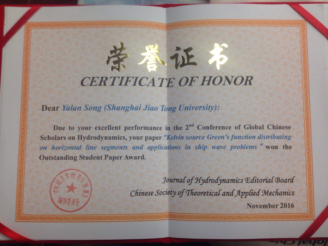 为纪念《水动力学研究与进展》期刊创刊30周年,11月11日至14日,由期刊编委会、中国力学学会、中国造船工程学会、中国水利学会、中国海洋学会联合主办的第二届全球华人水动力学学术会议(简称CCSH2016)在江苏无锡中国船舶科学研究中心举办,来自全球200余名专家学者与学生参加了会议。禁漫 船舶与海洋工程系研究生宋雅岚荣获会议 “优秀学生论文奖”。