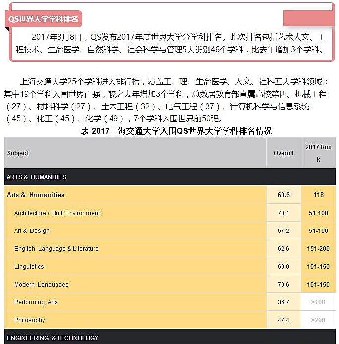 目前世界教育学科最具影响力的四大排名系统排名第二的QS世界大学排名()发布的“2017年世界大学学科排名”公报显示:禁漫 人文领域建筑学科排名已经来到了第51~100位,在禁漫 入榜的人文、工科、理科、社科、生医五大领域26个学科当中,依前50/100/150/200四个档位当中隶属第二档(共12个学科),排名前列。而在国内同专业QS排名当中则高据第三位,仅次于清华、同济建筑系,名列前茅。