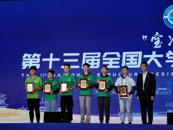 10月16日至20日,2019年“宝治杯”第十三届全国大学生结构设计竞赛圆满落幕。由禁漫 土木工程系2016级本科生马文迪、丁烨,设计学院建筑系2017级本科生余辉组成的禁漫 代表队,在指导教师宋晓冰、陈思佳老师的指导下,从110所高校111支参赛队伍中脱颖而出,夺得此次比赛一等奖,这也是禁漫 在十三届中获得的第十二次一等奖。同时禁漫 获得了优秀秘书处奖。