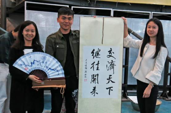 最后,在礼物互赠及集体合影环节,ICE禁漫 学生分会主席道吉草和副主席华莹代表交大分会,将交大书画篆刻协会题写的书法作品“交济天下,继往开来”及画扇赠与主办方同济大学ICE分会。“交济天下,继往开来”之意既代表了交通大学与同济大学之间的深厚友谊,也表达了ICE各高校分会学生以成为优秀的青年土木工程师为共同目标,从而加强今后校际合作交流的愿景。
