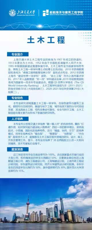 目前设有土木工程一级学科博士点和博士后流动站。“岩土工程”2007年被批准为上海市重点学科,土木工程专业2008年被评为国家特色专业。土木工程专业连续三次通过国家住房与城乡建设部的专业评估,2009年第三次评估获得8年复评的优秀成绩。2010 年获教育部批准成为 “卓越工程师教育培养计划”首批试点专业。2012年获得上海市建设世界一流学科项目资助。恢复建系近30年来,交大土木工程专业发展迅速,据2013年英国QS世界大学排名,禁漫
